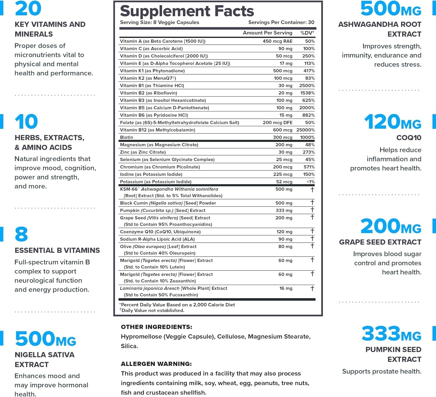 Together, these ingredients support immune function, energy metabolism, hormonal balance, and overall physical and mental performance.